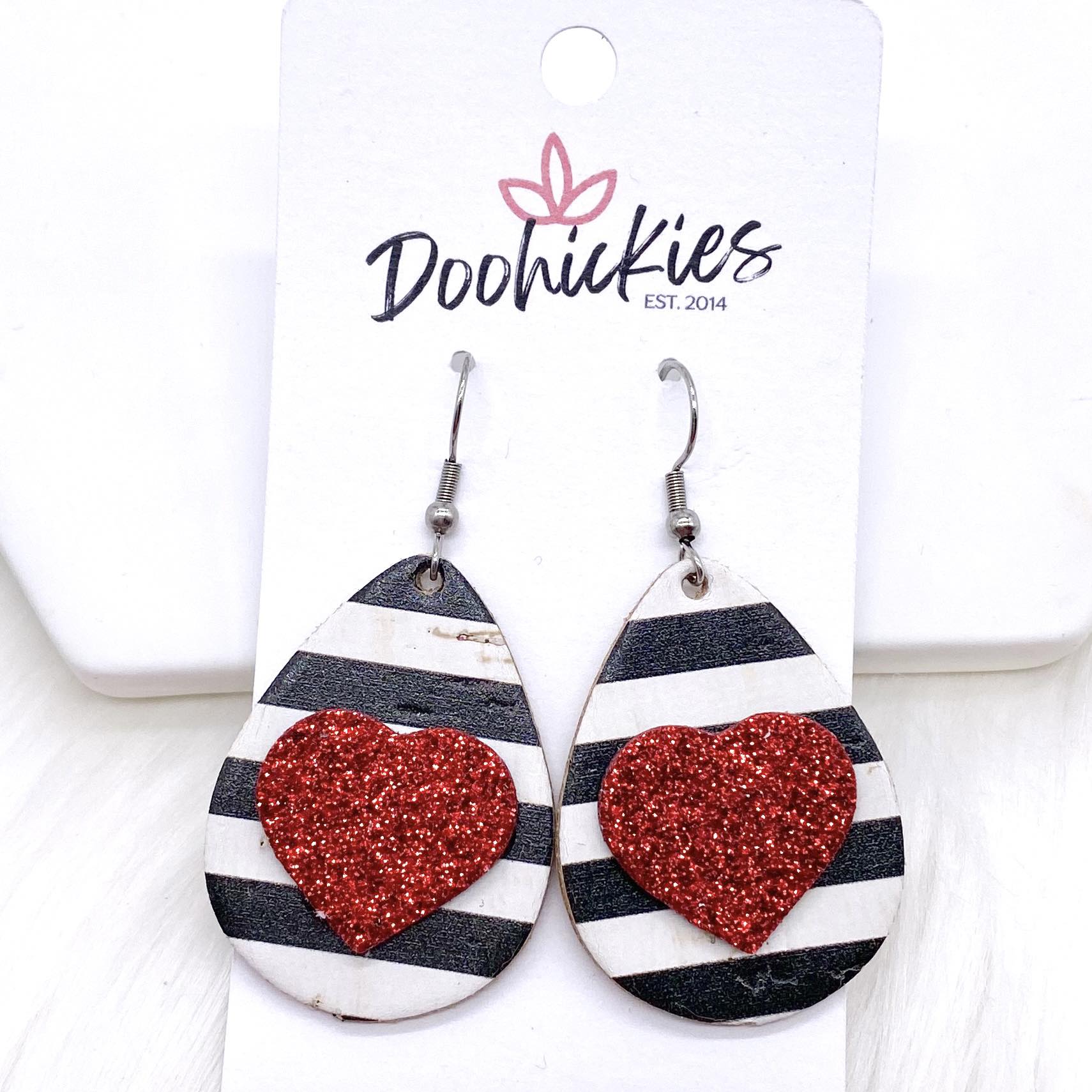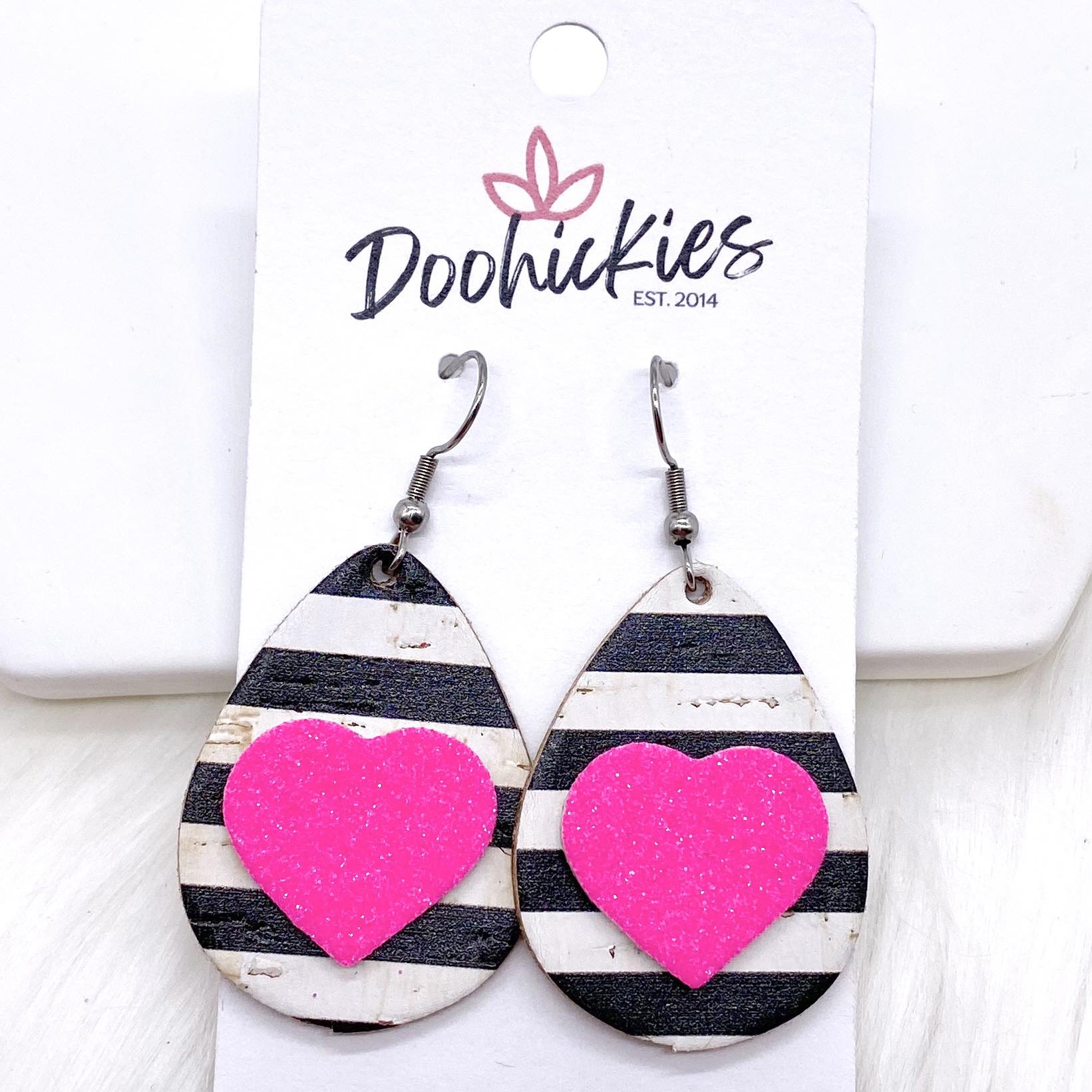 1.5" Valentine 3-D Glitter Hearts & Striped Teardrop Corkies -Earrings