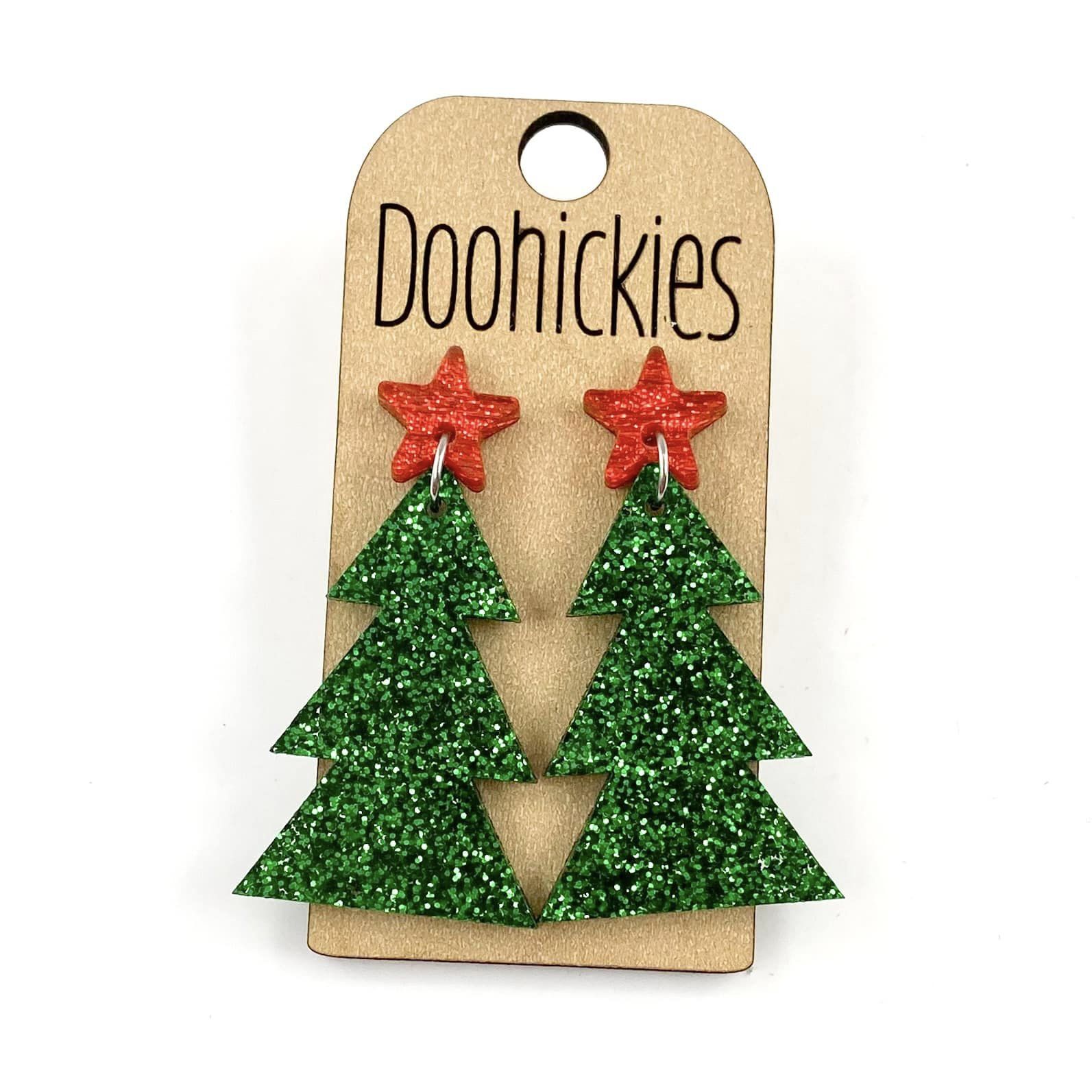 1.75" Red Sariano Star and Evergreen Glitter Layered Trees - Christmas Acrylic Earrings