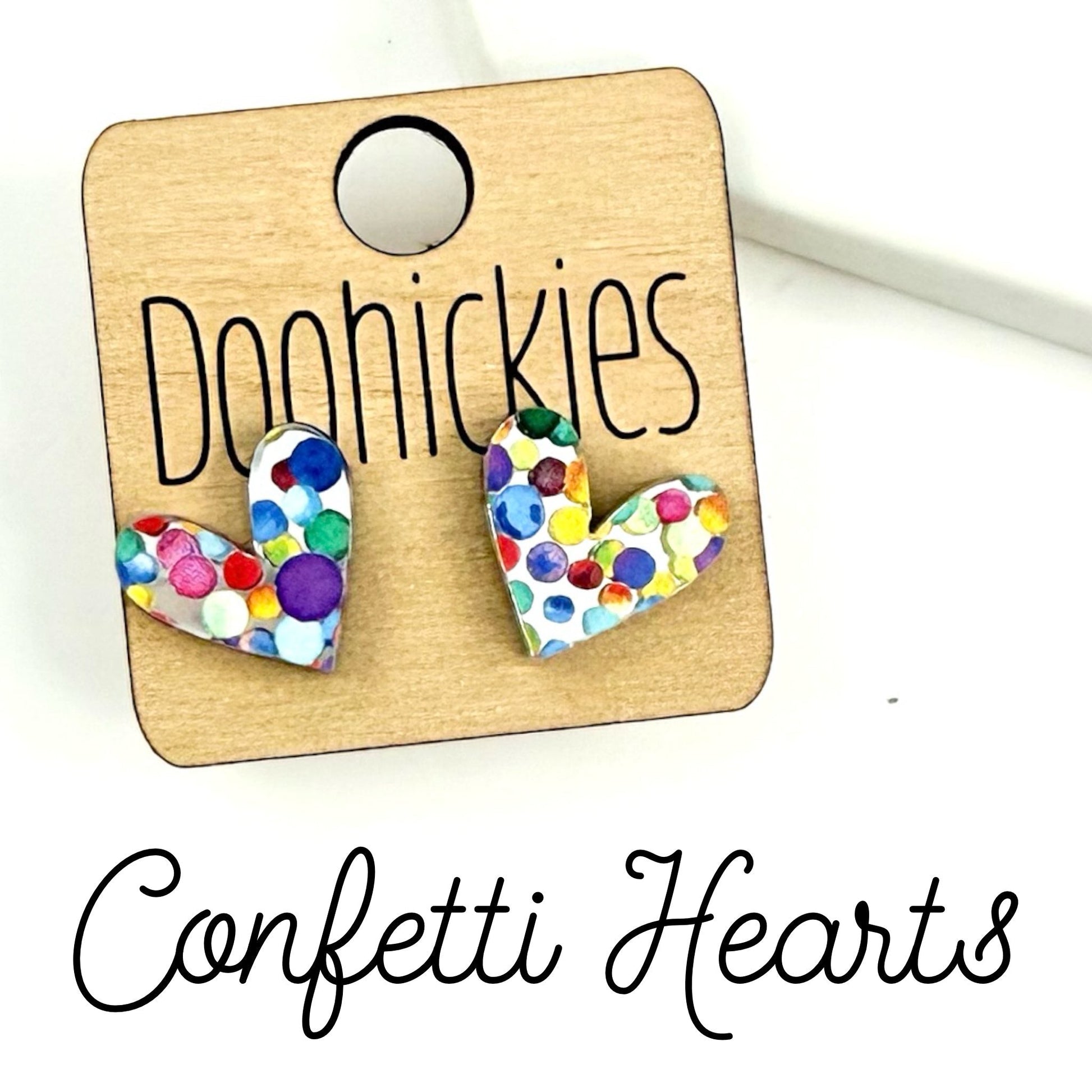 Spread the love with these cheerful heart studs that bring instant joy to any outfit! Featuring vibrant confetti dots and swoopy heart designs, these playful earrings are perfect for Valentine's Day or whenever you want to add a pop of color and personality to your look. Lightweight and comfortable for all-day wear, they're an easy way to express your fun, romantic side. Whether you're celebrating love or just embracing your inner optimist, these studs deliver charm and whimsy in spades.