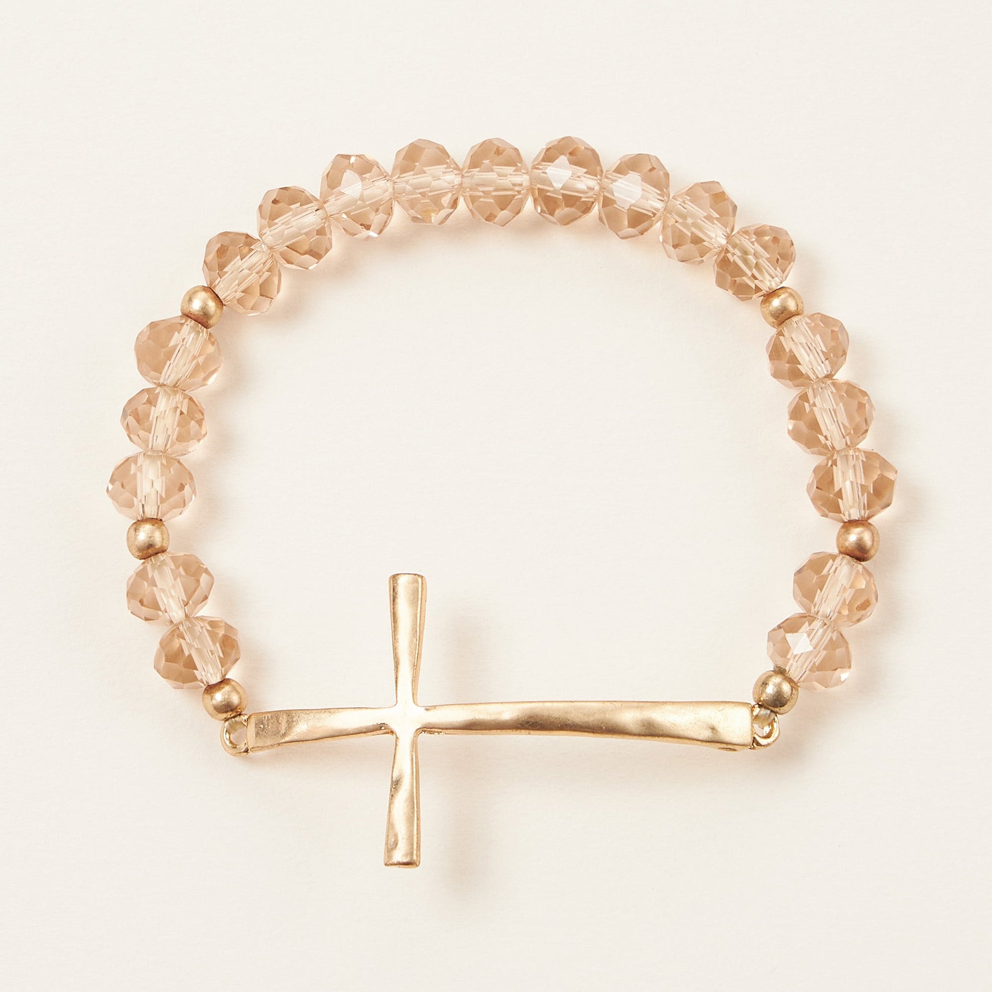 This Glass and Metal Beaded Stretch Bracelet with hammered metal cross shaped charm adds a touch of elegance to any outfit. With its stretch design, it offers a comfortable fit for all wrist sizes. Perfect for everyday wear or special occasions.