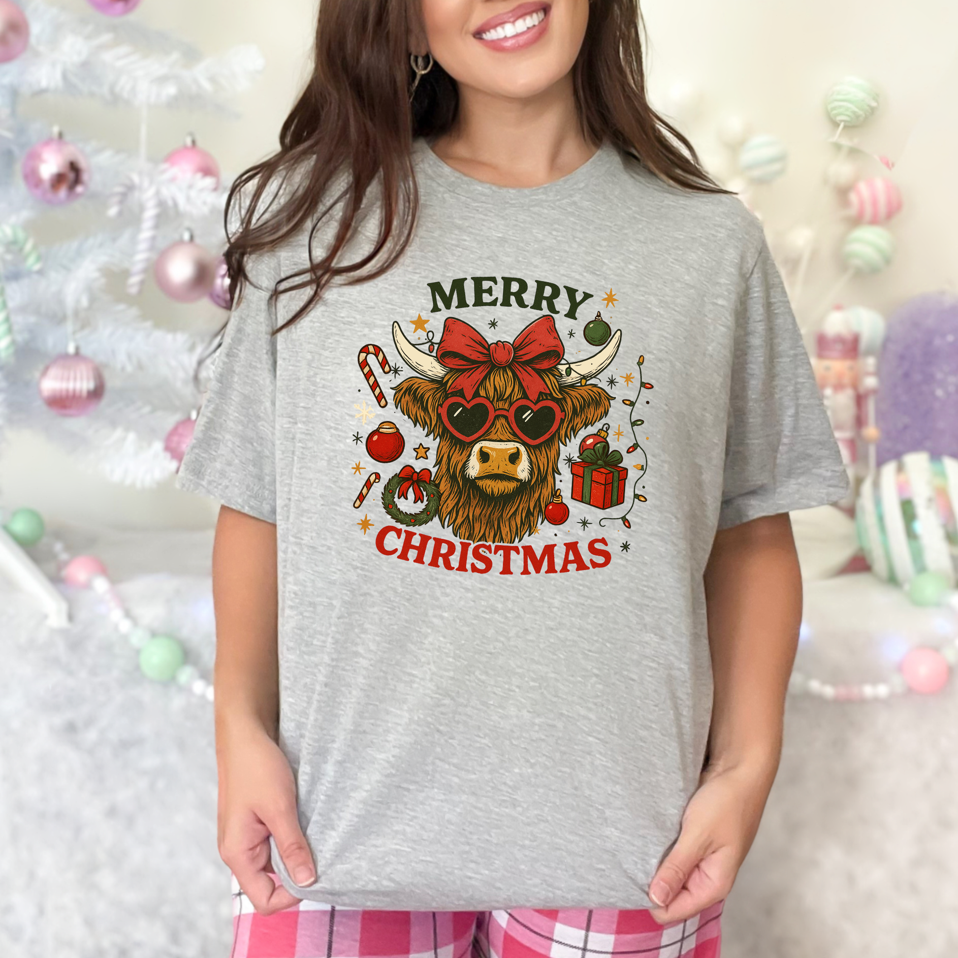 Add some festive farm charm to your holiday wardrobe with this adorable Highland cow tee! Featuring a cute cow in heart-shaped glasses and a big red bow surrounded by Christmas cheer, it’s perfect for cozy days and seasonal smiles.