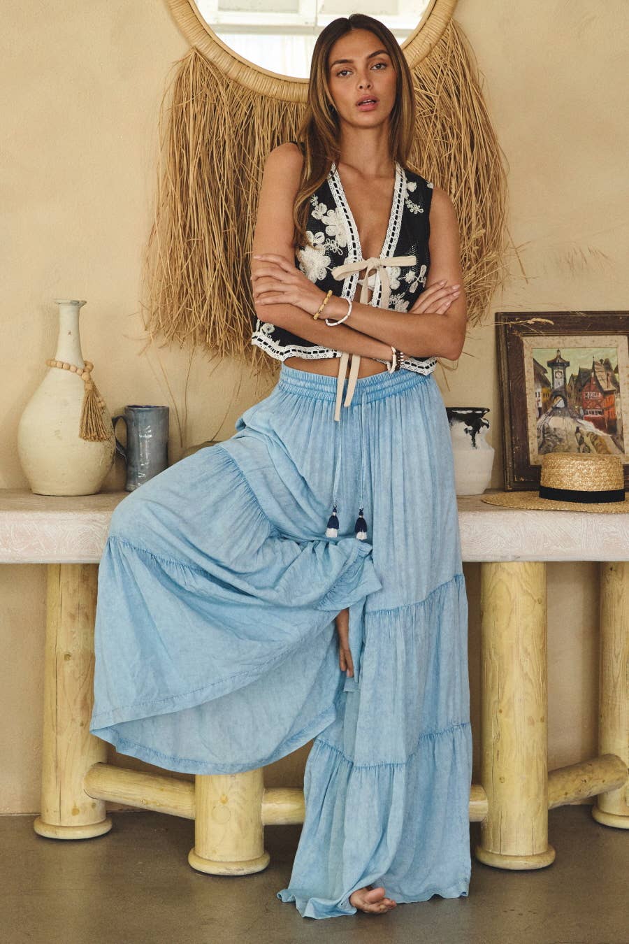 Sleeveless embroidered vest with contrast trim, tie-front closure, and a cropped silhouette.